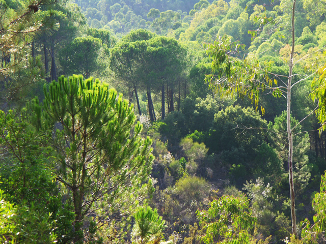 El matorral, las dehesas mixtas de encinas y alcornoques, los bosques de ribera y las plantaciones de pinos y eucaliptos conforman las principales formaciones vegetales del paraje natural, con una menor presencia de olivares, frutales y cultivos de herbáceos.
